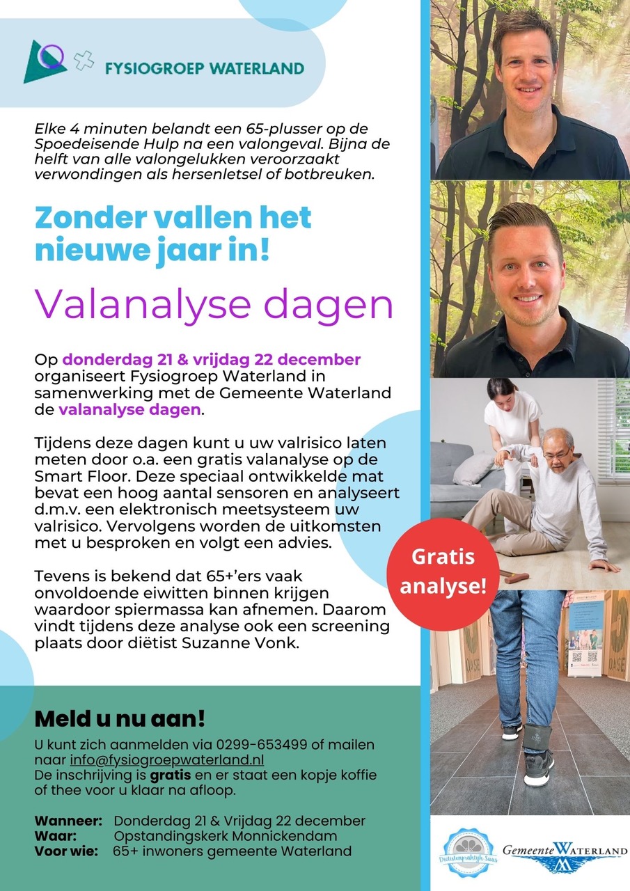Alles begint bij het ontdekken of u een verhoogd valrisico heeft. Hierbij wordt u zich bewust van het risico dat u loopt. Om deze reden organiseren wij op donderdag 21 en vrijdag 22 december in samenwerking met de gemeente Waterland de valanalyse dagen.